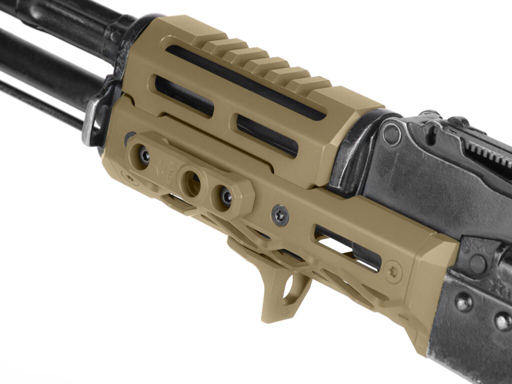 M-Lok montáž zajistí pevné spojení s předpažbím, pažbou nebo lištou. Konstrukce počítá i s náročným zacházením – žádné viklání, žádné přemlouvání šroubů. Když to jednou přichytíte, drží to tak, jak má. Ať už se zbraň houpe přes záda, nebo letí z ruky při výměně za pistoli.