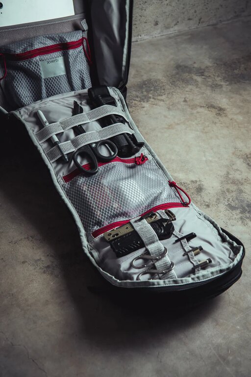 Světlý interiér zlepšuje orientaci i v horších světelných podmínkách. Síťované kapsy, sloty na výbavu, suché zipy a kotevní body drží obsah pod kontrolou. Přední admin kapsa nabídne sloty na zásobníky nebo lékárničku a elastické úchyty pro modulární doplňky. Dvouvrstvá přihrádka ochrání notebook i další zařízení a spodní část umožní uchycení příslušenství kompatibilního se suchým zipem.