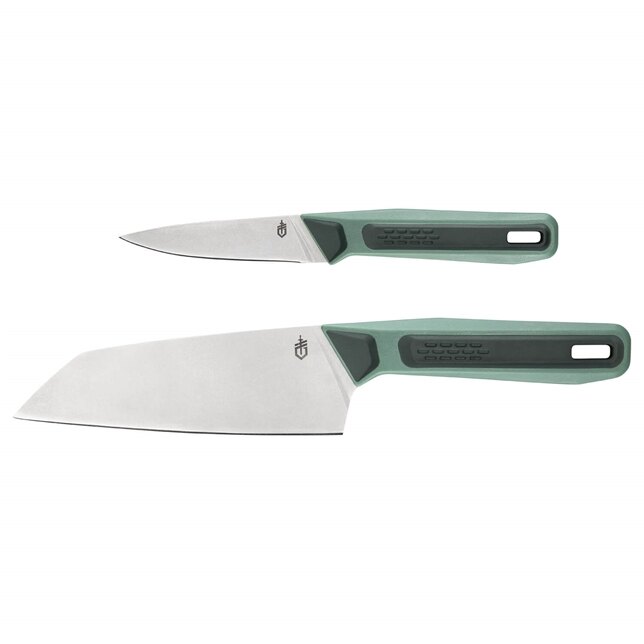 Gerber vybavil sadu dvěma kuchyňskými noži – menším pro přesnější práci a větším pro hlavní přípravu. Ostří z nerezové oceli zvládá časté krájení a drží ostrost i při častém používání. Rukojeti z polypropylenu s pogumovanou částí dobře sedí v ruce a nekloužou, ani když pracujete s mokrými surovinami.