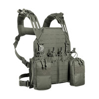 Laser-cut MOLLE vazba umožňuje rozšíření o další výstroj podle potřeby. Přední část tvoří výškově nastavitelná klopa se suchým zipem, která umožňuje vložení balistického plátu typu SAPI (do velikosti M). Chest rig tak lze přizpůsobit od lehkého setupu až po variantu s doplňkovou ochranou bez nutnosti výměny vybavení.