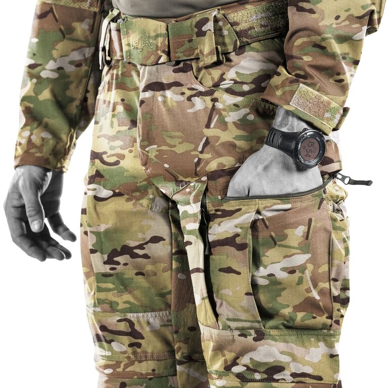 Pro operace v horkém počasí jsou kalhoty vybaveny velkými ventilačními otvory na stehnech, které lze otevřít pomocí zipu. Integrovaná moskytiéra umožňuje proudění vzduchu a zároveň chrání před hmyzem a nečistotami. Konstrukce kolen je kompatibilní s modulárním systémem UF PRO a nabízí pětistupňové nastavení výšky chráničů, což umožňuje individuální přizpůsobení podle potřeby.