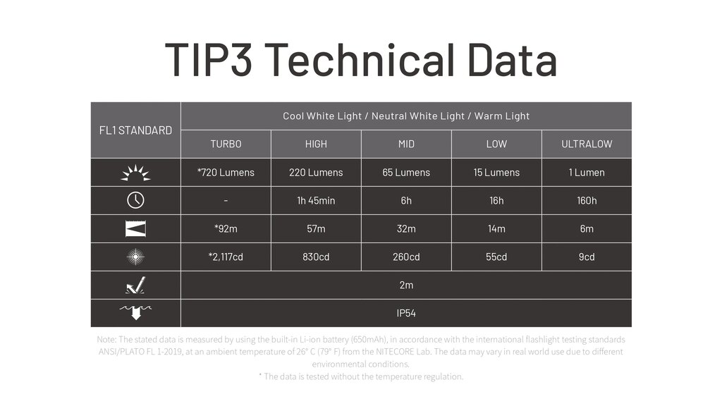 Kompaktní tělo a nízká hmotnost dělají z TIP3 společníka, který nepřekáží. Dá se nosit na klíčích, v kapse, připnout na batoh nebo použít s klipem pro svícení bez držení v ruce. Konstrukce počítá s běžným provozem, vlhkem i drobnými nárazy. Nabíjení probíhá přes běžný USB-C kabel a svítit lze i během dobíjení.