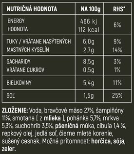CampCore Wild Pork přináší pořádnou porci chuti i energie – kdekoli a kdykoli. Vepřový guláš s kaší a houbami nasytí i po dlouhém dni v terénu, na vodě nebo v práci. Díky samoohřevu si dopřejete horké jídlo bez vařiče, elektřiny i mikrovlnky. Prostě otevřít, aktivovat a jíst.