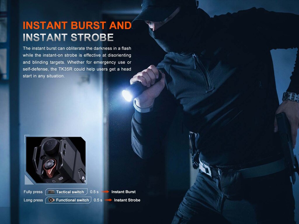 Taktický spínač na konci zajišťuje okamžitou reakci a rychlé použití stroboskopu. Vedlejší tlačítko slouží k přepínání mezi úrovněmi výkonu. TK35R si pamatuje poslední nastavený režim a při každém zapnutí naváže tam, kde skončila. Indikace stavu baterie navíc hned po spuštění ukáže, jak je na tom energie.