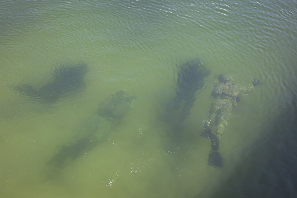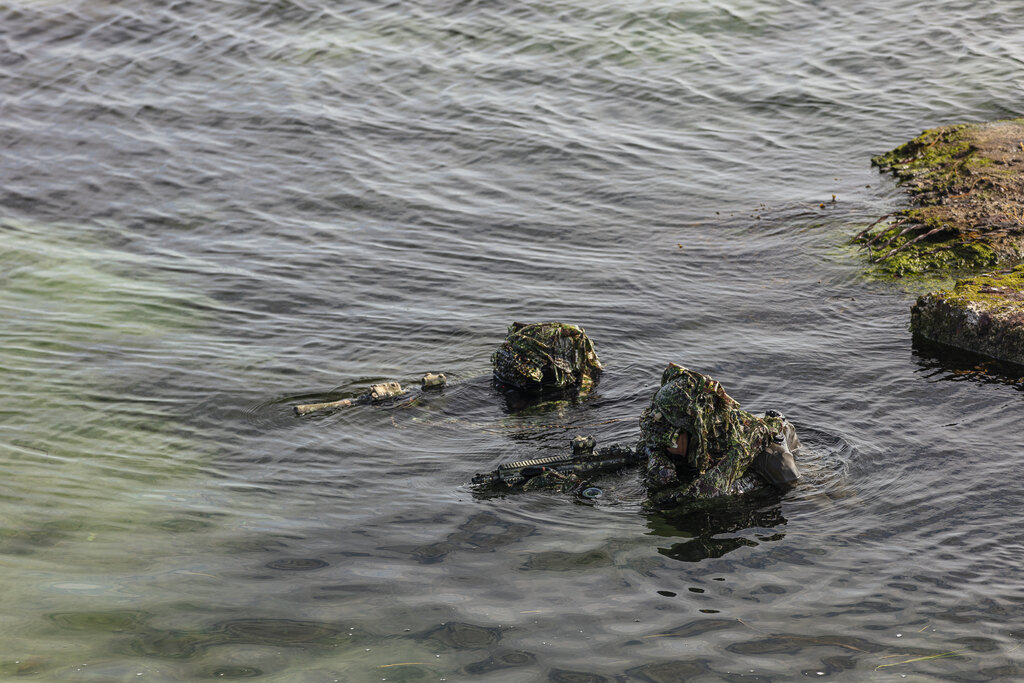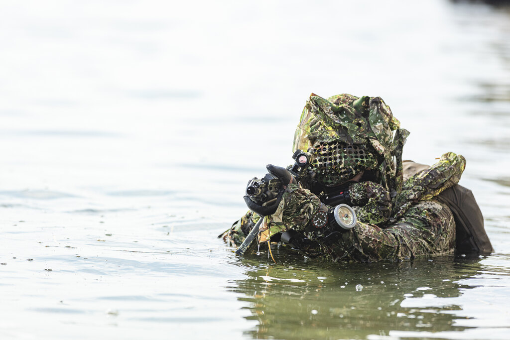 Maskovací oblek DIVER CAMO má výztuž Cordura na loktech i kolenou i kamufláž pro hřbety rukou. Dodává se včetně krytu potápěčské masky. Oblek se používá přes mokré i suché oblečení.