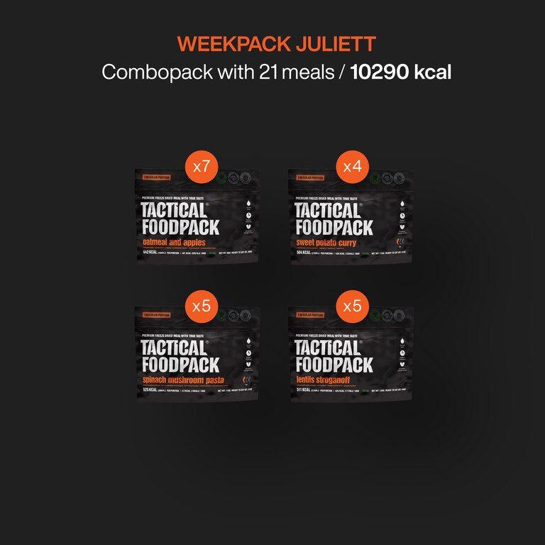 Weekpack Juliett je navržen tak, aby poskytl kompletní vegetariánskou stravu pro jednu osobu na sedm dní. Obsahuje 21 různorodých jídel – od sladkých snídaní po syté hlavní chody. Každé jídlo je lyofilizované (sušené mrazem), což zajišťuje dlouhou trvanlivost až 8 let a zachování chuti i nutričních hodnot.