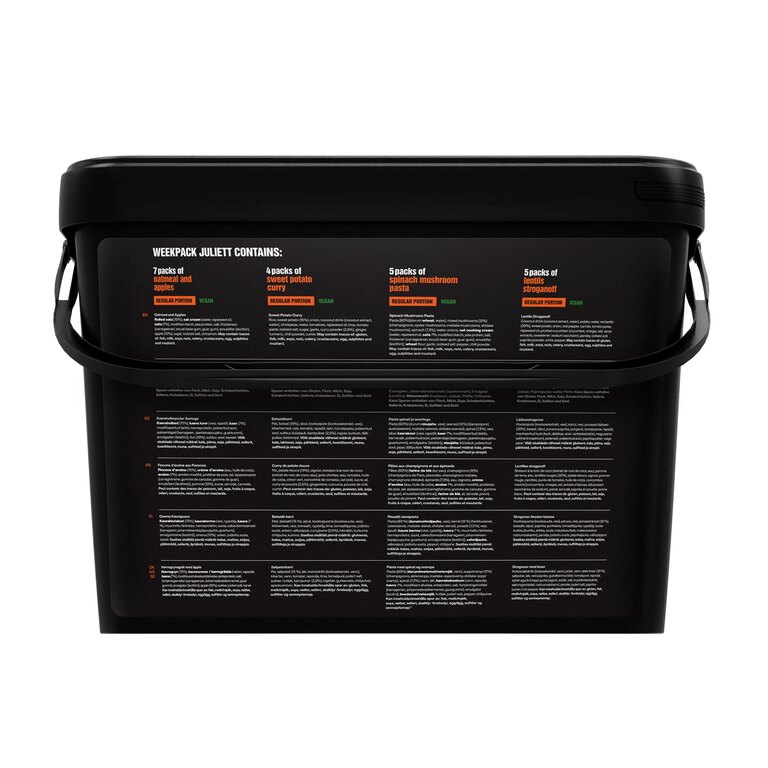 | Součástí dodávky | Baleno ve vodotěsné nádobě Celkem 21 jídel 7× Ovesná kaše s jablky 4× Batátové kari 5× Těstoviny se špenátem a houbami 5× Čočkový Stroganov |