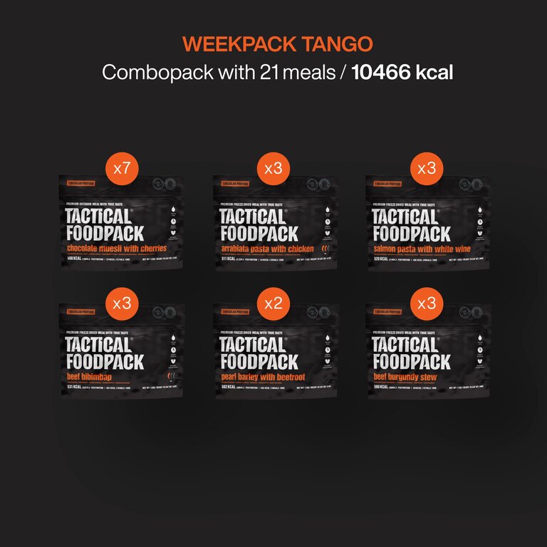 Weekpack Tango je navržen tak, aby poskytl kompletní stravovací potřeby jednoho člověka na sedm dní. Obsahuje 21 různorodých jídel – od sladkých snídaní po syté hlavní chody. Každé jídlo je lyofilizované (sušené mrazem), což zajišťuje dlouhou trvanlivost až 4 roky a zachování chuti i nutričních hodnot.