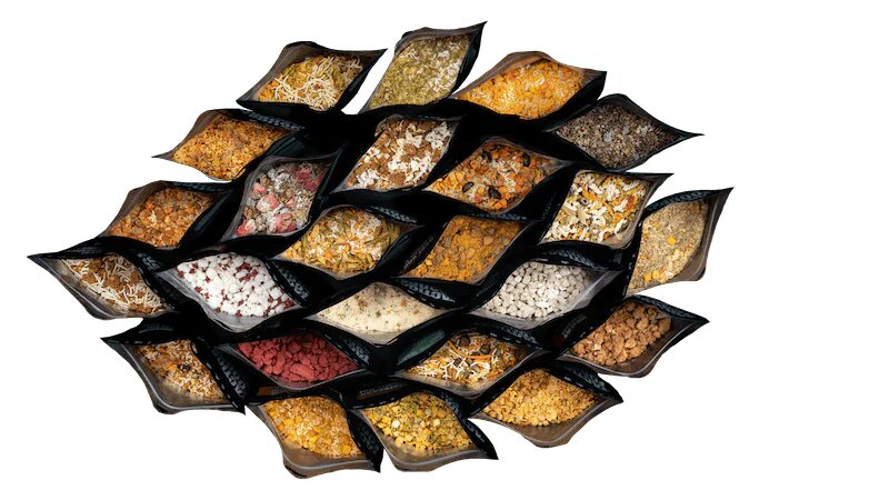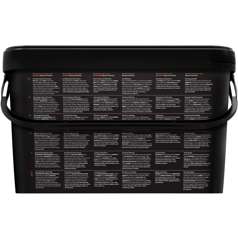 | Součástí dodávky | Baleno ve vodotěsné nádobě Celkem 21 jídel 7× Čokoládové müsli s třešněmi 3× Těstoviny Arrabiata s kuřecím masem 3× Těstoviny s lososem a bílým vínem 3× Hovězí Bibimbap 2× Perlový ječmen s červenou řepou 3× Hovězí guláš po burgundsku |