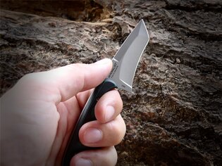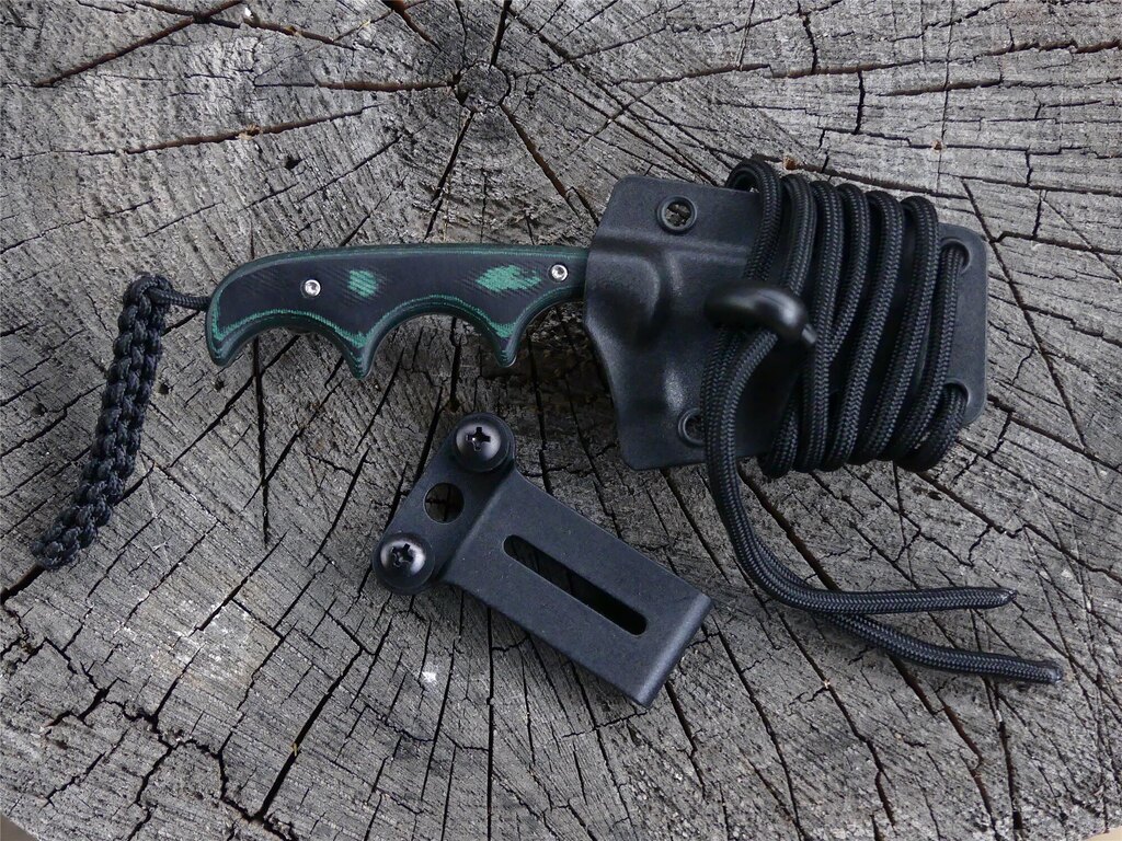 Čepel je vyrobena z ušlechtilé oceli 5Cr15MoV. Tanto tvar s krátkou špičkou a stejnou tloušťkou téměř po celé délce má vynikající odolnost. Osvědčí se hlavně při penetraci silnějších materiálů, kdy by hrozilo poškození špičky. Lehce prohnuté ostří se hodí pro širokou škálu řezacích úkolů. Rukojeť má výrazné prohlubně pro tři prsty a spolu s vroubkováním na horní části čepele zajišťuje pevný a jistý úchop i zapření palce. Střenky jsou vyrobeny z vrstveného laminátu Micarta, který je lehký, velmi odolný a pevný. Jemná zdrsňující textura má protiskluzové vlastnosti. Na konci rukojeti je splétaný nylonový copánek, za který můžete nůž snadno a rychle vytáhnout. Nůž je dodáván s černým pouzdrem z tvrzeného nylonu, které má na konci nastavitelnou šňůrku pro zavěšení na krk. Můžete ho také pomocí odnímatelné spony zavěsit i na opasek nebo popruh.