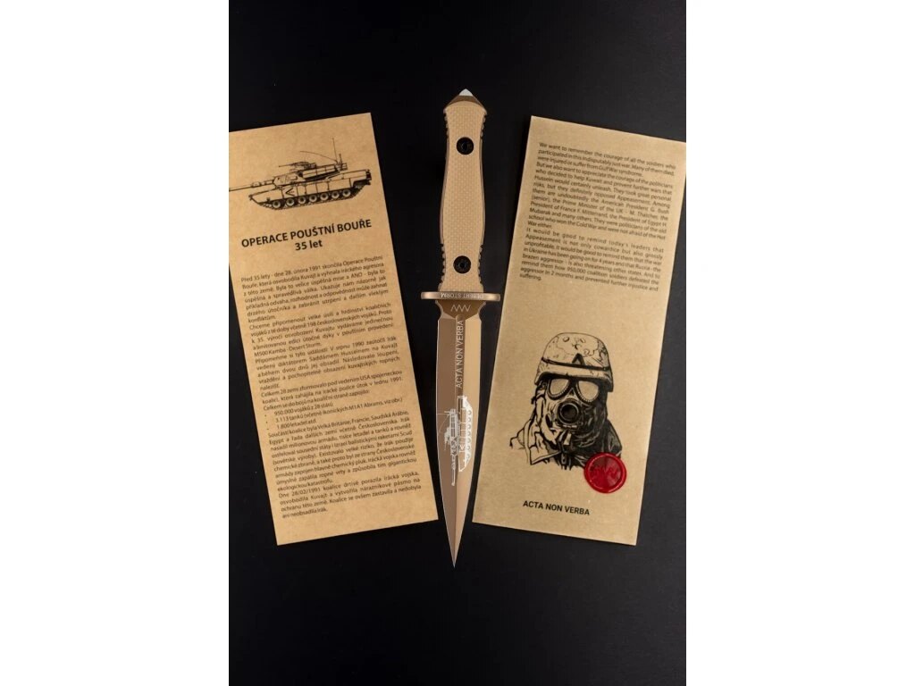 Nůž s pevnou čepelí M500 Kamba Desert Storm ANV vznikl jako připomínka Operace Pouštní bouře a odvahy československých vojáků, kteří byli připraveni čelit i těm nejtvrdším hrozbám. Barevné provedení Coyote inspirované pouštním prostředím operace, odolné materiály a číslovaná série dávají každému z 198 kusů vlastní jedinečný význam.