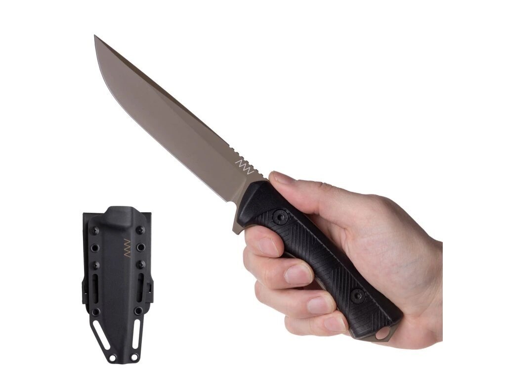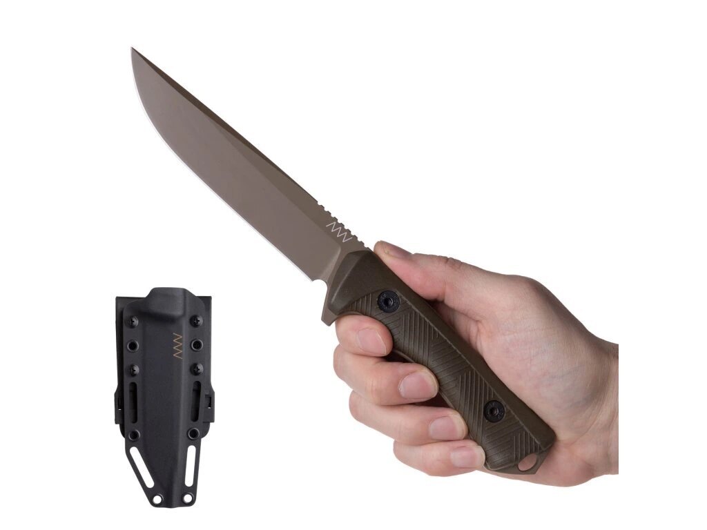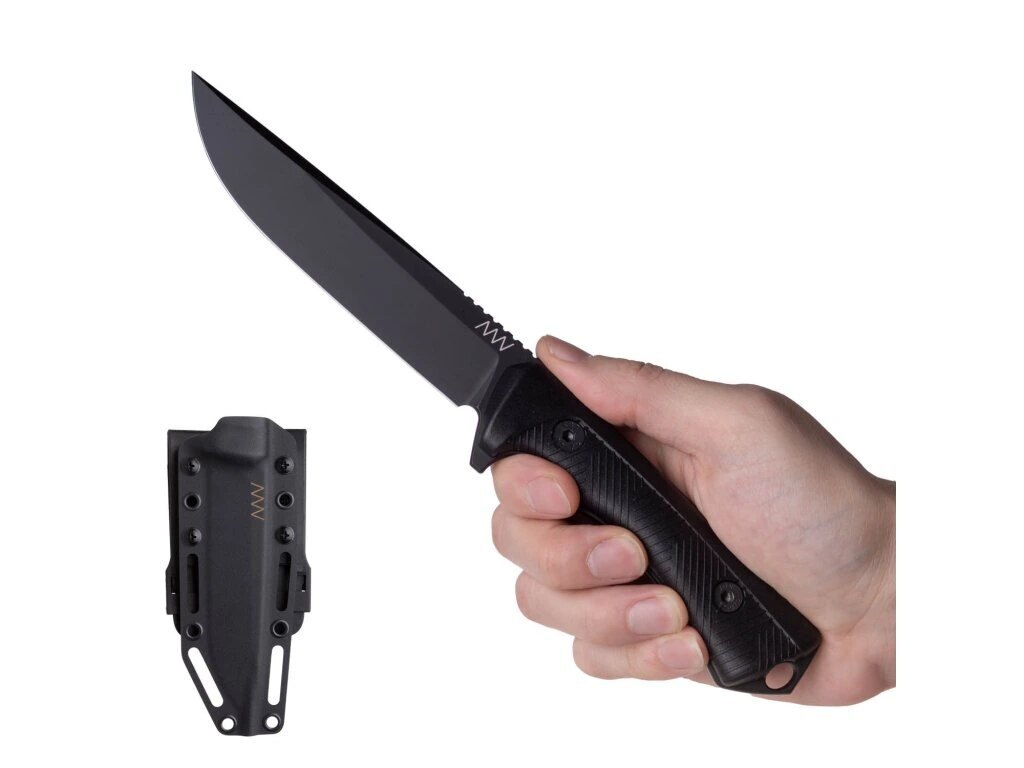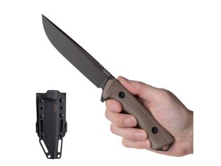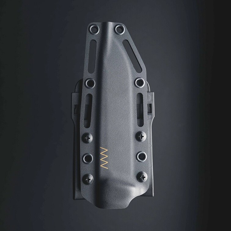 Součástí balení je ručně vyráběné samosvorné kydexové pouzdro. Modulární drážky a přiložené MOLLE klipy umožňují různé způsoby uchycení podle výstroje. Pouzdro drží nůž bezpečně na místě a umožňuje rychlý přístup. Řešení je navržené pro stabilní nošení při pohybu.