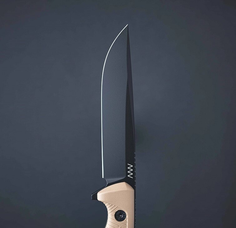 P300 je postavený na dlouhé a masivní čepeli se zesílenou špičkou, která zvyšuje odolnost při namáhání. Použitá ocel Sleipner je kryogenicky kalená a zvolená s ohledem na houževnatost a stabilitu ostří. Tvar čepele typu skinner podporuje kontrolu při práci a plynulé vedení řezu. Povrch chrání odolná úprava Cerakote určená pro dlouhodobé používání.
