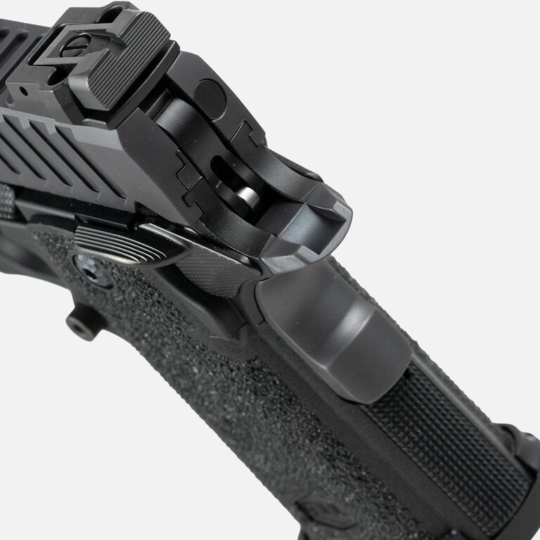 Rukojeť je tvarovaná tak, aby seděla pevně v ruce a poskytovala stabilní úchop i při kritické manipulaci ve stresových situacích. Ovládací prvky jsou snadno dostupné, nepůsobí rušivě a nezachytávají se o oblečení při tasení.