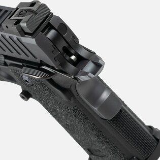 Závěr z nerezové oceli má agresivnější serraci v přední i zadní části, díky čemuž se s ním dobře pracuje i v rukavicích nebo pod stresem. Vroubkování zlepšuje jistotu úchopu při natahování a odlehčené provedení podporuje svižný zákluz závěru. Výsledkem je zajímavá estetika zbraně i praktický dopad na snížení vnímaného zpětného rázu.