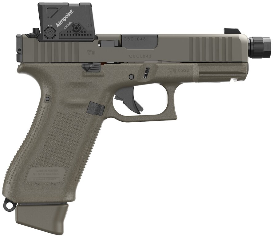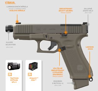 Další specifikace | Gen5 konstrukce, nDLC / DLC povrch, GLOCK Marksman barrel (polygonální rifling), Safe Action spoušťový systém, Loaded Chamber Indicator, flared magwell, ambidextrous slide stop, dostupné kapacity 17 / 20, Hunter edice — olive green finish, továrně osazen Aimpoint COA |