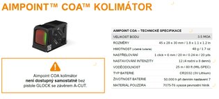 Glock 45 Gen6 A-CUT COA COMBO spojuje výhody integrovaného kolimátoru, plnohodnotného rámu a kompaktního závěru do jednoho funkčního zbraňového systému. Vznikl ve spolupráci značek GLOCK a Aimpoint, které spojily zkušenosti ze služebního i civilního použití. Pistole přichází s kolimátorem osazeným přímo z výroby, takže odpadá řešení kompatibility nebo montáže. Crossover konstrukce nabízí jistý úchop i rychlou manipulaci při zachování kompaktnější horní části. Nová generace přidává přepracovanou ergonomii, plně oboustranné ovládání a vylepšené ovládací prvky. Celek je připravený k okamžitému použití bez dalších zásahů.