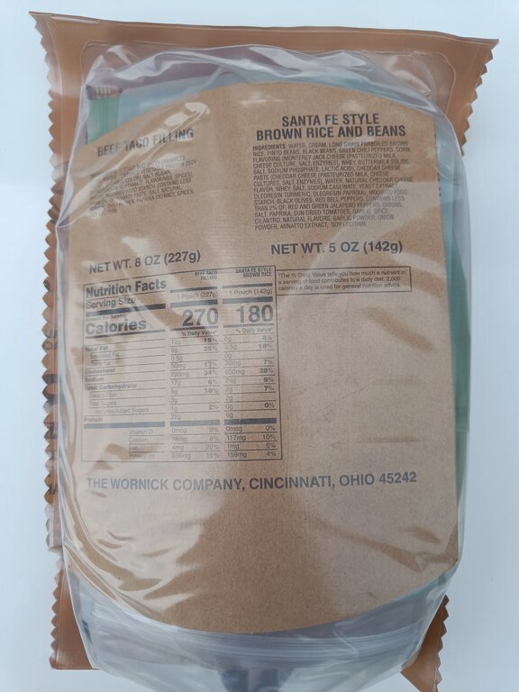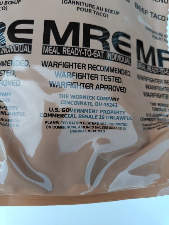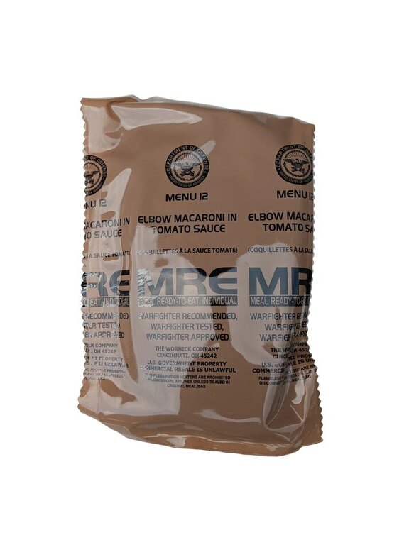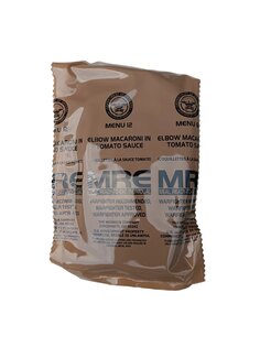 | Další specifikace | Originální vojenská potravinová dávka používaná armádou USA Kompletní jídlo v 1 balení Hermeticky uzavřený obal Vysoká energetická hodnota Bez potřeby vařiče nebo ohně - ohřívač dodáván v každém menu Použití ohřívače bezpečné i v interiéru Dlouhá trvanlivost (při správném skladování) Jak připravit MRE: Vložte sáček s jídlem do přiloženého ohřívače Přidejte malé množství vody Počkejte přibližně 10 min až 15 min Jídlo je připravené ke konzumaci |