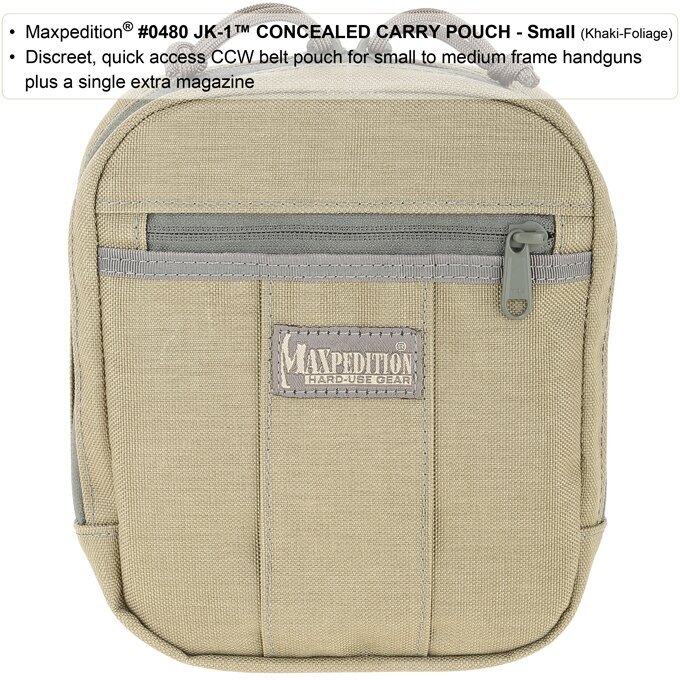 Pouzdro Maxpedition JK-1 je diskrétní opaskové pouzdro určené pro CCW (= concealed carry weapon, tedy skryté nošení zbraně). Je navrženo pro malé a střední pistole s 1 náhradním zásobníkem. Pouzdro je vynikající alternativou ke klasickému pistolovému pouzdru na opasek.