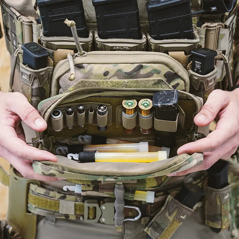 Pouzdro Rear Hanger Agilite Gear je uloženo vzadu, ale přesto k němu dosáhnete sami. Ergonomické poutko a rychloodnímatelný systém umožní kapsu otevřít i zavřít jedním tahem. A když je třeba, dá se dočasně připevnit dopředu na suchý zip nosiče nebo sumku, aby byl obsah hned po ruce.