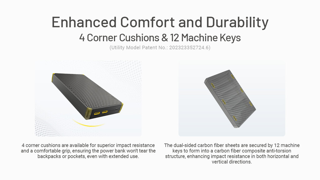| Další specifikace | Již 3. generace přináší inovace a vylepšení Ultra lehká - pouze 291 g, o 10,3 % lehčí než její předchůdce O 13 % kratší než její předchůdce a kratší než iPhone 15 Pro Konstrukce odolná vůči nárazům, tlaku a deformacím (proti kroucení) - spojena 12 spojovacími prvky Rohové chrániče tlumí nárazy a eliminují trhání kapes oblečení nebo batohu Schválená pro leteckou přepravu Baterie: Li-ion Kapacita: 20 000 mAh Články - napětí / energie: 3,6 V / 72 Wh Jmenovitá energie: 11 220 mAh (při výstupním napětí 5 V) Gravimetrická měrná energie: 247 mWh/g 2 USB porty typu C: výstup - 5 V, 3 A / 9 V, 2,22 A / 12 V, 1,68 A / 10 V, 2,25 A (max výkon 22,5 W); vstup - 5 V, 2 A / 9 V, 2 A (max výkon 18 W) Umí nabíjet dvě zařízení současně - duální porty s maximálním výkonem 15 W (napětí 5 V a proud 3 A) Super rychlá - rychlé nabíjení zařízení - 22,5 W i rychlé nabíjení powerbanky samotné - 18 W Podporované protokoly nabíjení: PD, QC, FCP a SCP Umožňuje průchozí nabíjení (současné nabíjení powerbanky a nabíjení zařízení z powerbanky) Počet nabití - vybraná zařízení: iPhone (13") - 1,2×; iPhone 15 Pro - 3,8×; Huawei Mate 60 - 2,8×; čelovka UT27 Nitecore® - 9,8×; nabíjecí baterie NL1836R Nitecore® - 4× LED indikace stavu baterie/nabití - 4 modré LED (75 % a více - svítí 4; 50 % až 75 % - svítí 3; 25 % až 50 % - svítí 2; 10 % až 25 % - svítí 1; méně než 10 % - bliká 1) Ovládání: tlačítko na dolní straně vedle LED indikátoru Bezpečnostní ochrany - proti zkratu, přepětí, nadproudu, přehřátí, přebití i nadměrnému vybití Krytí: IPX5 (odolá dešti i sněhu) |