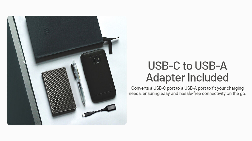 Dva USB-C porty zvládnou dobíjet dvě zařízení najednou a díky protokolům QC, PD, FCP a SCP poznají, co je připojeno. Umí průchozí nabíjení – takže doplňuje energii sobě i přístrojům zároveň. V balení je navíc adaptér USB-C → USB-A pro starší kabely.