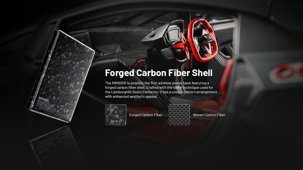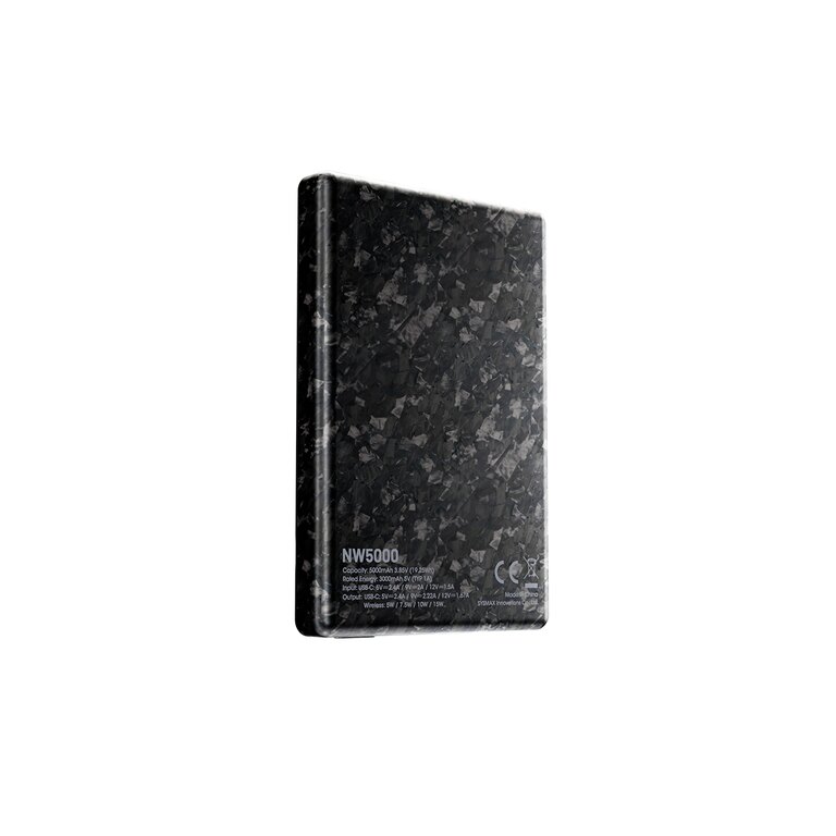 Tělo z kovaných karbonových vláken není jen efektní. Stejná technologie se používá i u supersportů Lamborghini. Díky tomu je powerbanka NW5000 lehká, odolná a přitom pevná jako pancíř. Její materiál odolává opotřebení, otiskům i korozi, takže zůstane jako nová i po letech používání.