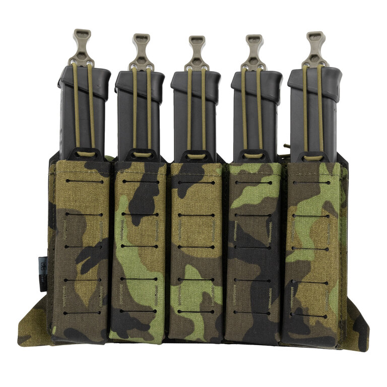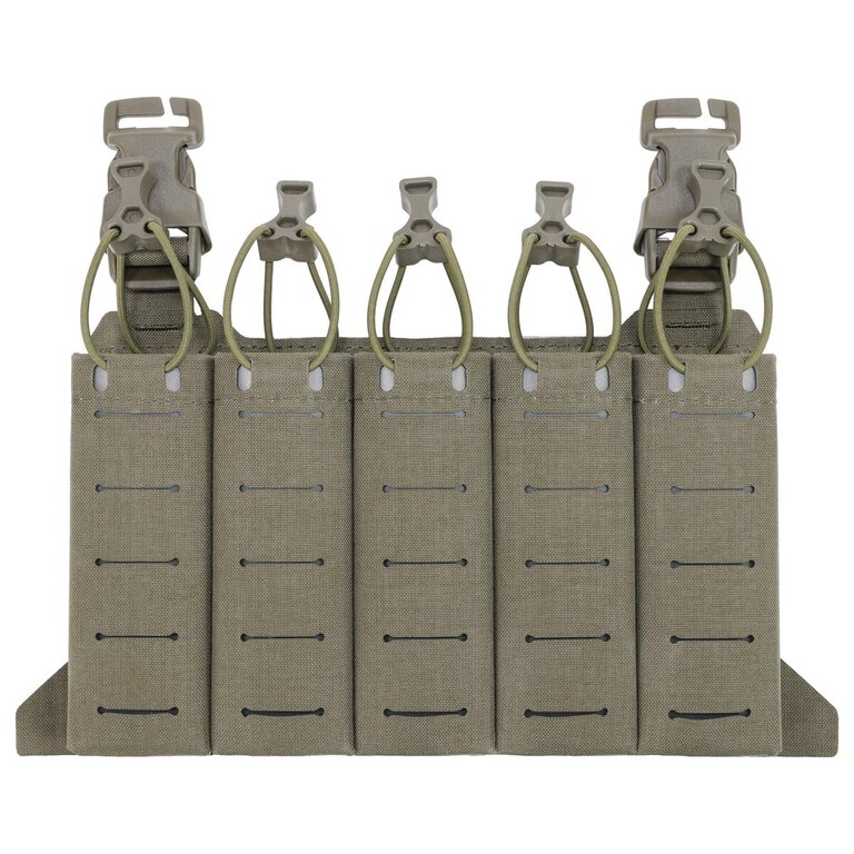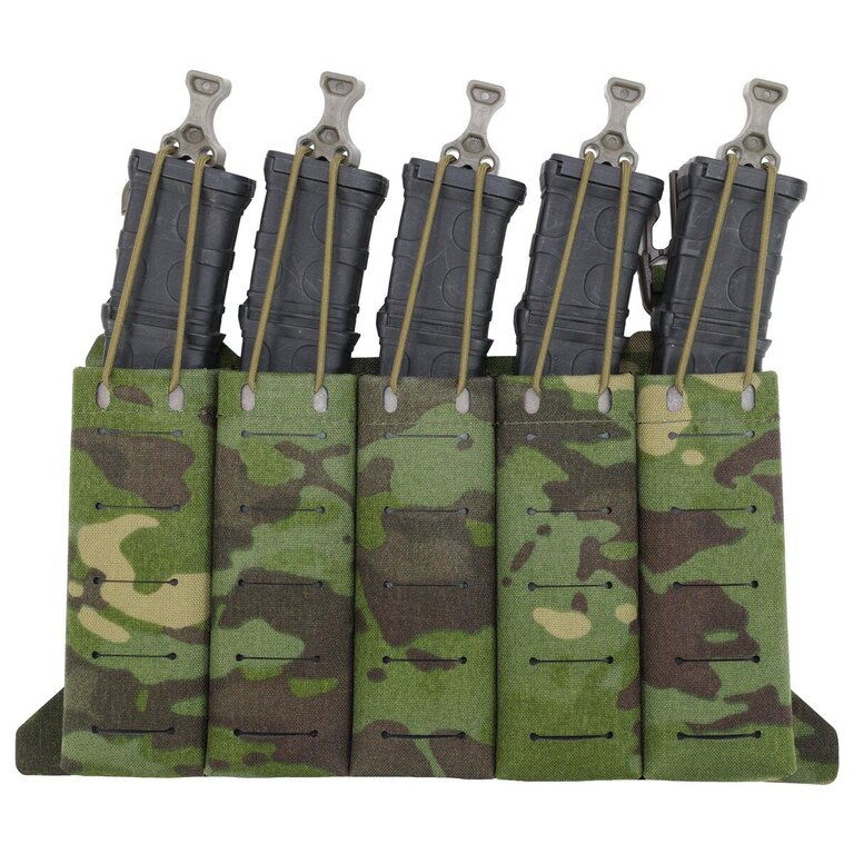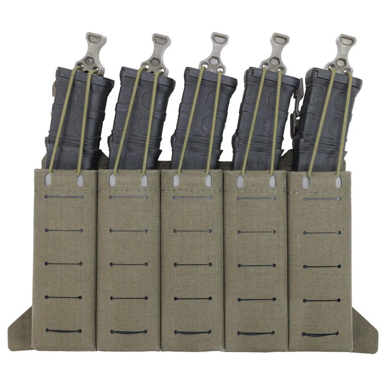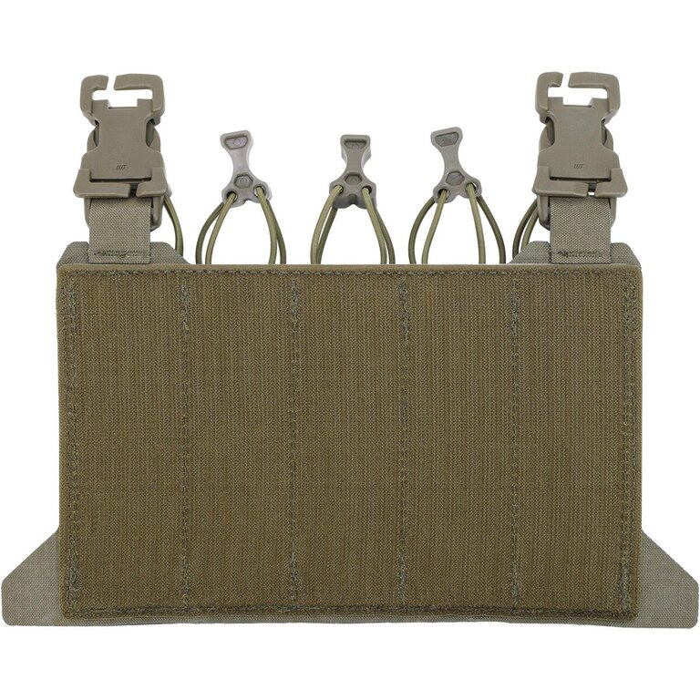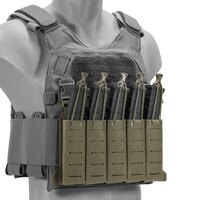 Nízkoprofilová konstrukce zajišťuje pohodlí i při delším nošení. Zásobníky drží pevně na místě díky pružným popruhům a elastickým vsadkám, které zároveň usnadňují jejich rychlé vytažení v kritických okamžicích. Na povrchu panelu se nachází MOLLE/PALS vazba pro integraci dalšího vybavení.