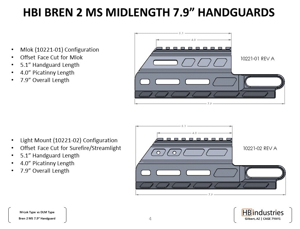 Předpažbí HB Industries M-LOK 7,8" CZ Bren 2 je kvalitní aftermarket předpažbí z hliníku. Toto předpažbí je určeno pro pušky Bren 2 Ms, a to v délkách hlavně 8", 9", 11" a 14" a v rážích 556/223 a 7,62×39. Jedná se tak o skutečně univerzální příslušenství.