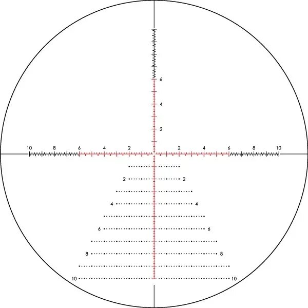 EBR-7D v první ohniskové rovině zajišťuje, že rozměry záměrné osnovy odpovídají reálným hodnotám při jakémkoli zvětšení. V praxi to znamená rychlé a přesné odhady vzdálenosti i korekce větru. Díky stromečkové osnově v dolních kvadrantech je možné provádět rychlé úpravy při opakovaných výstřelech. Osvětlení kříže zlepšuje čitelnost při menším zvětšení.