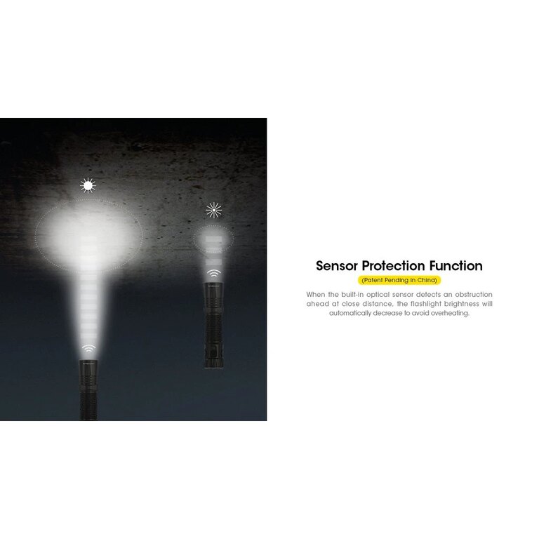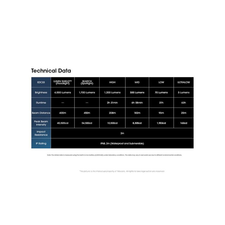 Měřeno dle standardu ANSI FL 1 v laboratorních podmínkách, za použití integrovaného dobíjecího Li-ion akumulátoru 18650 4 000 mAh, při určité teplotě a vlhkosti. Hodnoty se mohou lišit v závislosti na okolních podmínkách nebo způsobu použití svítilny (použití jiného zdroje napájení není možné).