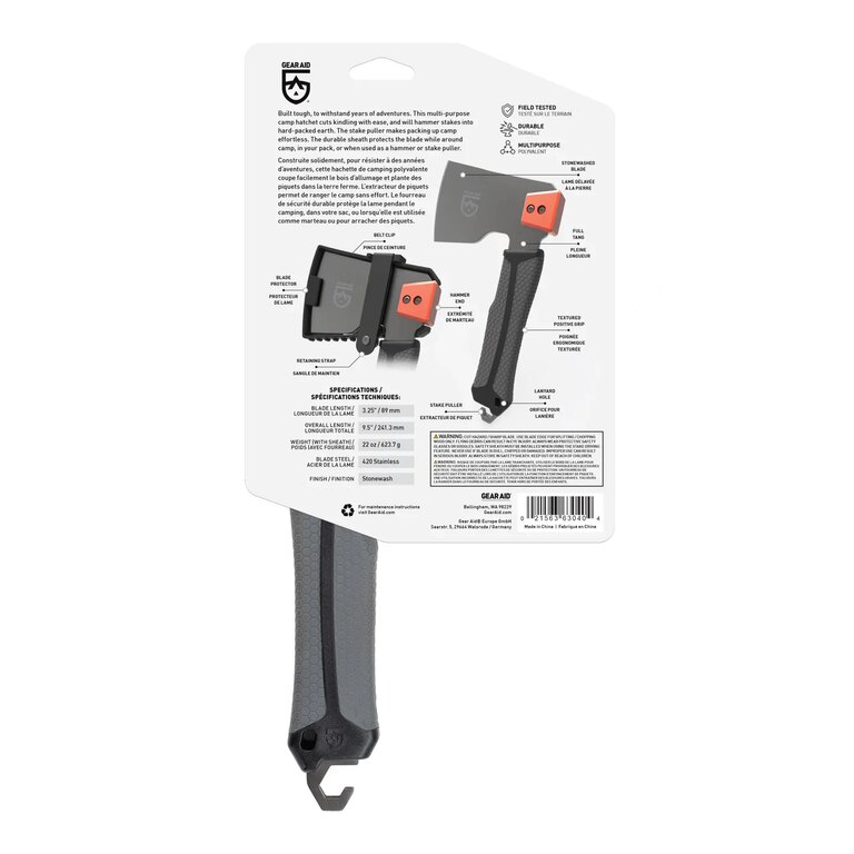 Kompaktní rozměry usnadňují přenášení i uložení v batohu. Ochranné pouzdro kryje ostří při transportu i při použití jako kladivo nebo vytahovač kolíků. Integrovaný klip na opasek a fixační pásek drží sekerku bezpečně na místě a připravenou k použití.
