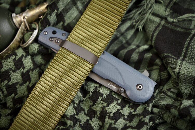 Nůž má odnímatelný nerezový klip pro uchycení na opasku nebo na vybavení pro nošení bez pouzdra.